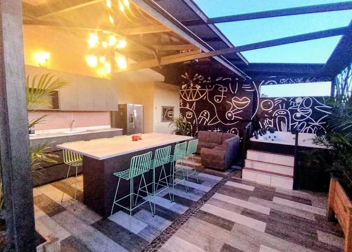 The spacious Skyluxe Medellin Penthouse Apartment is situated 6 minutes' walk from Teatriados and 5 km from Olaya Herrera airport. Welcoming guests with a hot tub, this apartment lies a short way from the San Pedro Cemetery Museum.